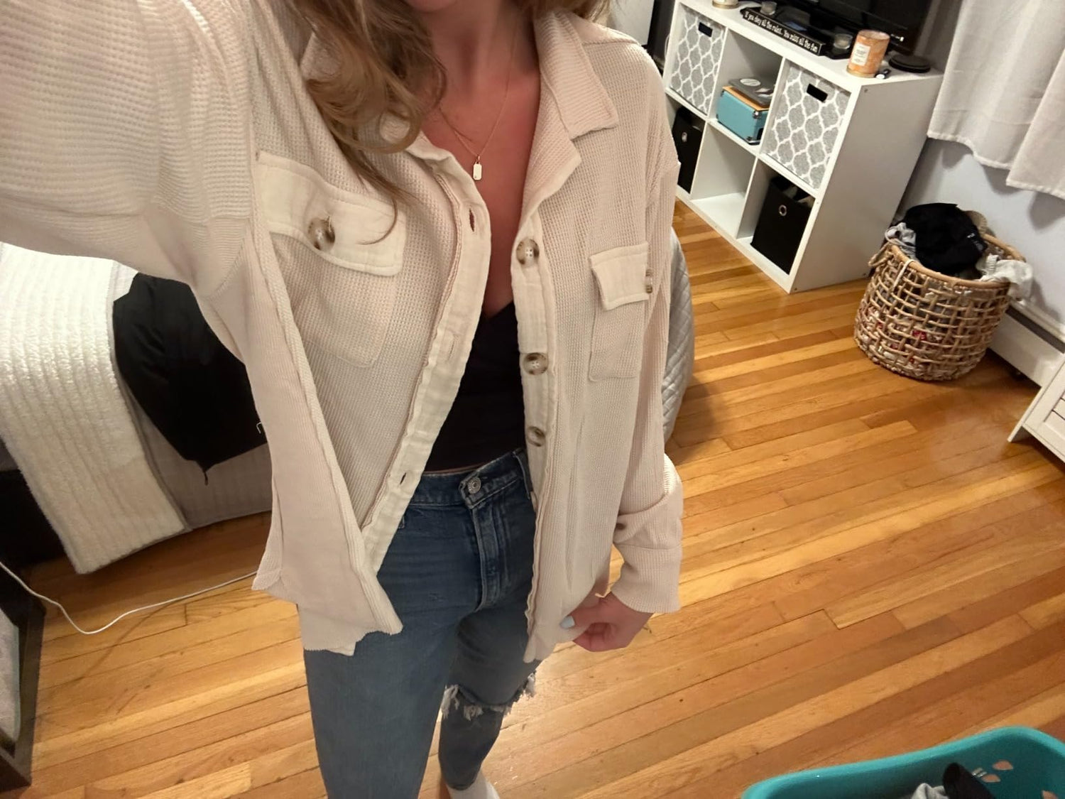 “super soft, super lightweight, super cute. the material is thin enough for spring/summer but still feels cozy. didn’t expect it to look this flattering on me but wow… new fave.”